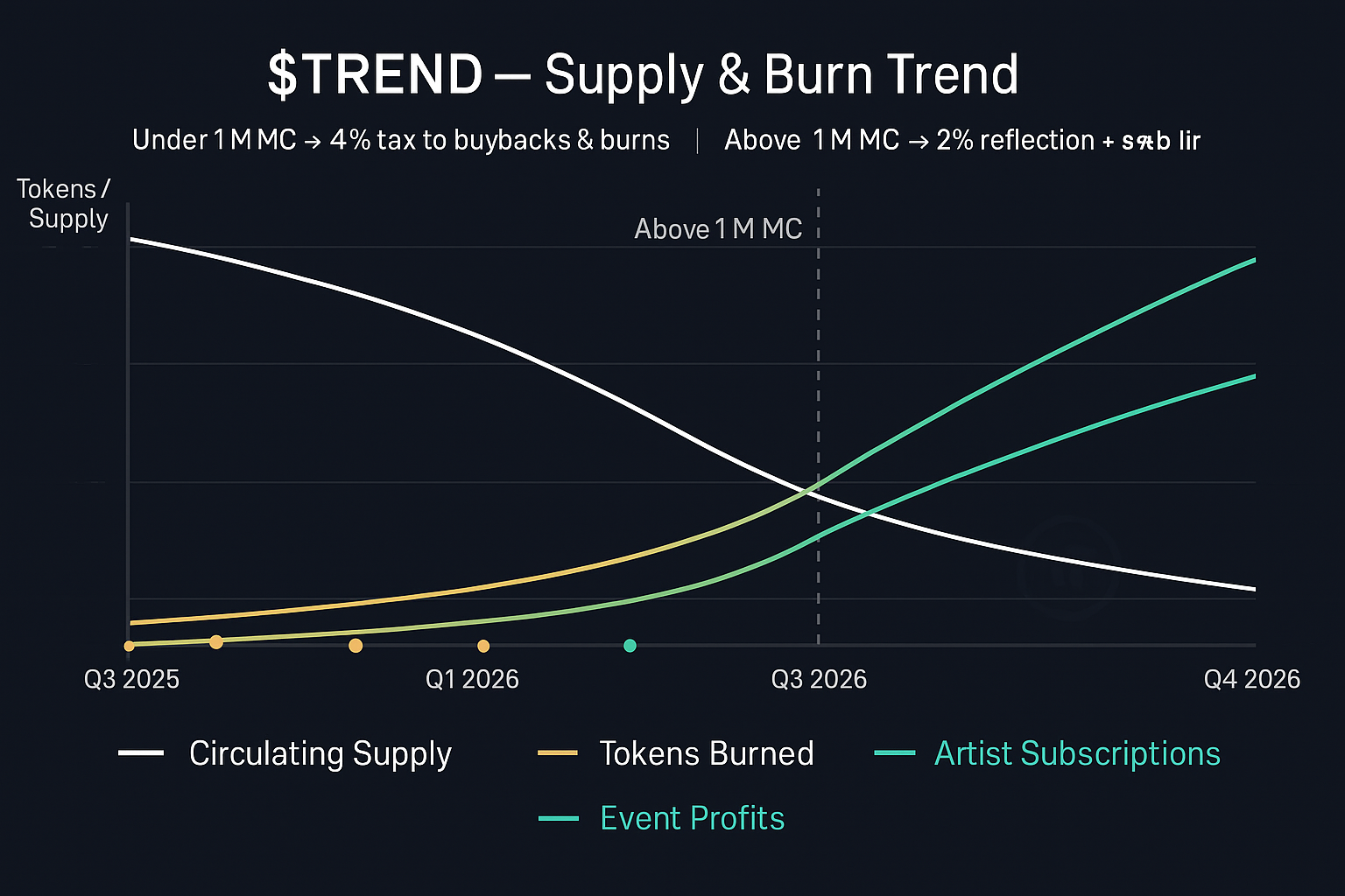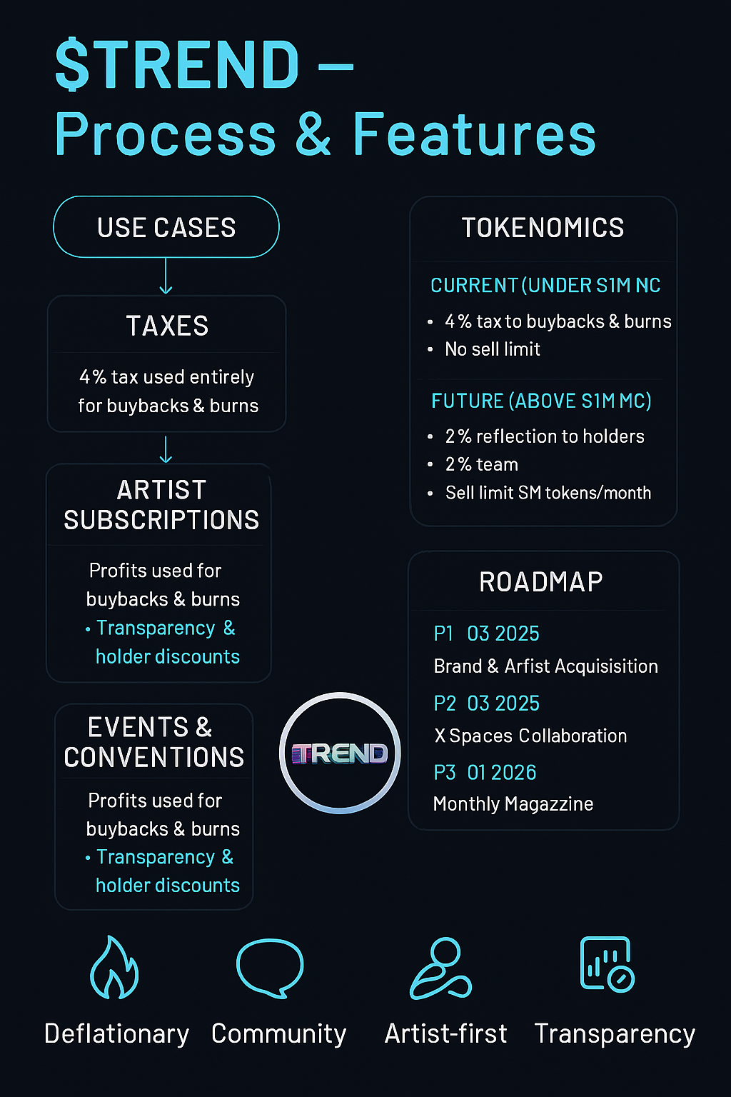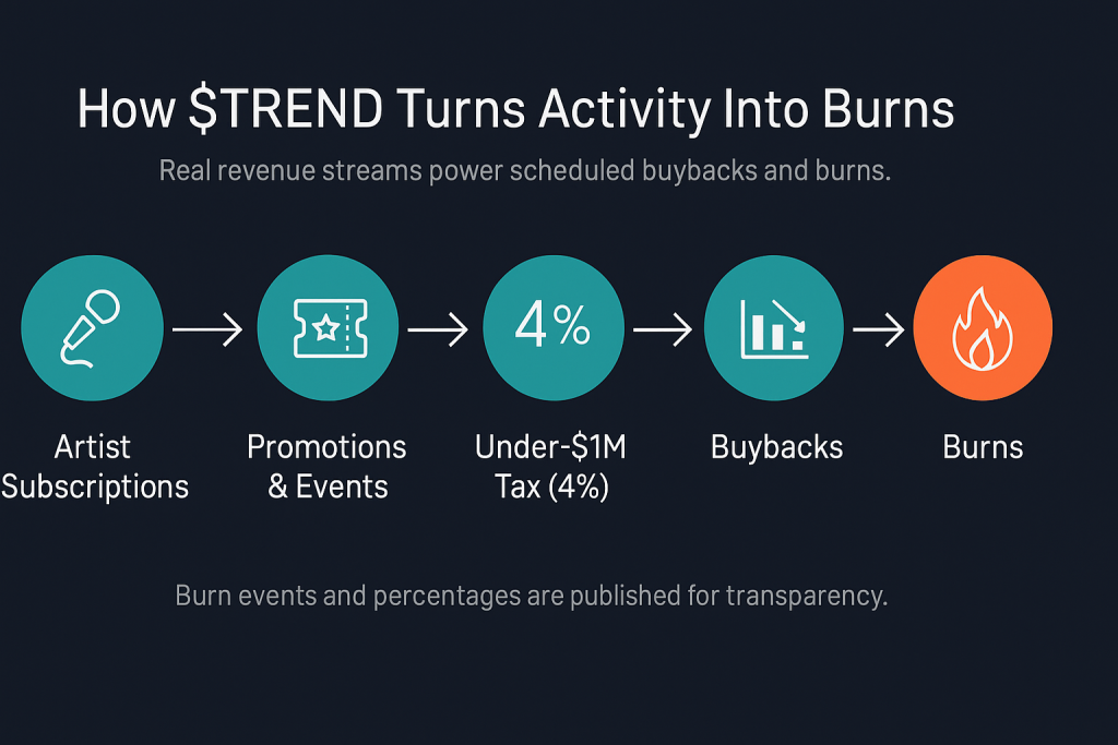 $TREND is a deflation-focused token that ties real activity—artist subscriptions, promotions, and events—to buybacks and burns, reducing circulating supply over time. Holders align with a growing creative ecosystem while the tokenomics adapt as market cap scales.